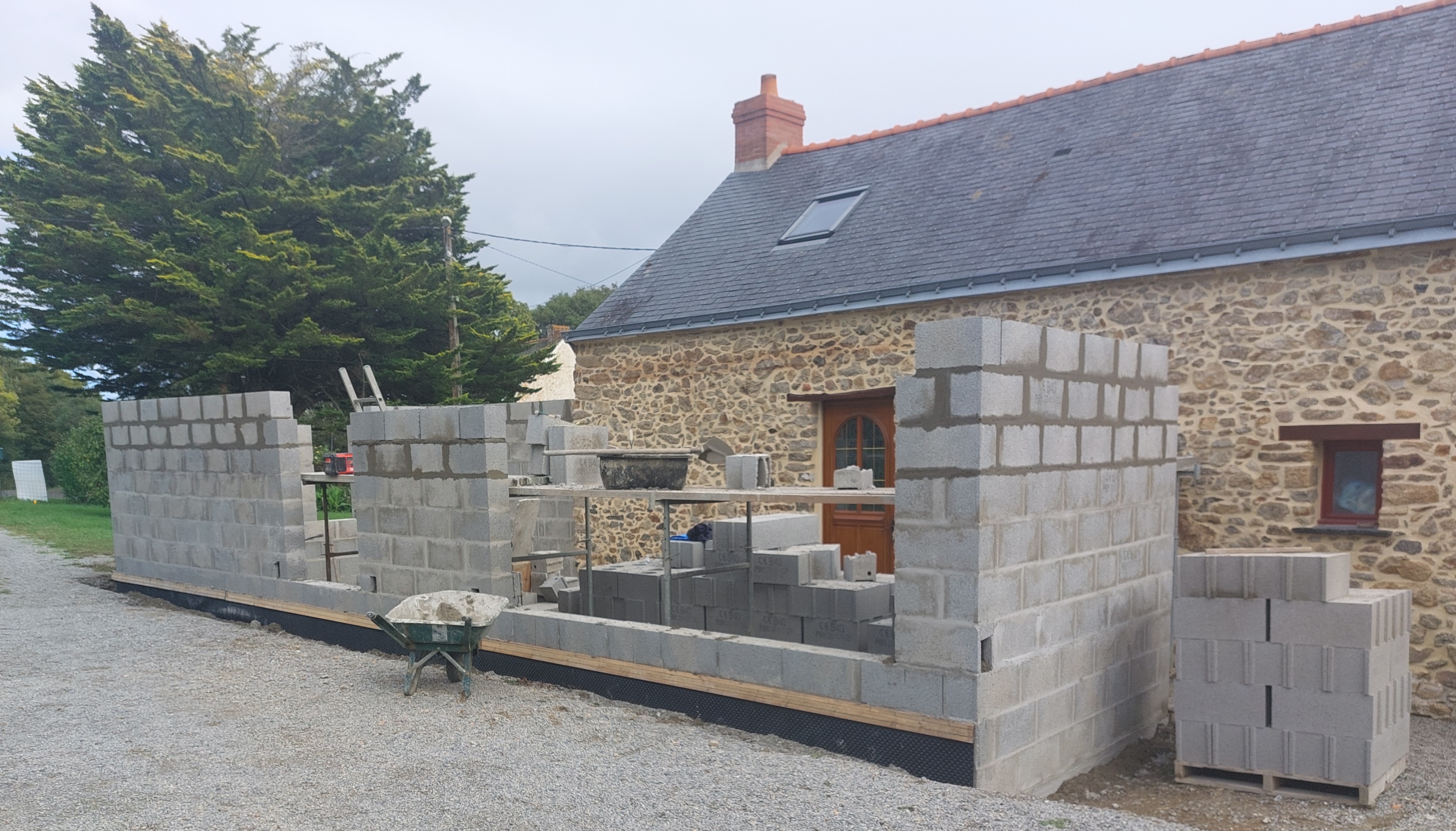 L’agrandissement réalisé par Réno Bâti Ouest Pour ce nouveau chantier nous avons crée une extension de 27 m² (2 chambres + salle d’eau) et un garage indépendant de 20 m².
