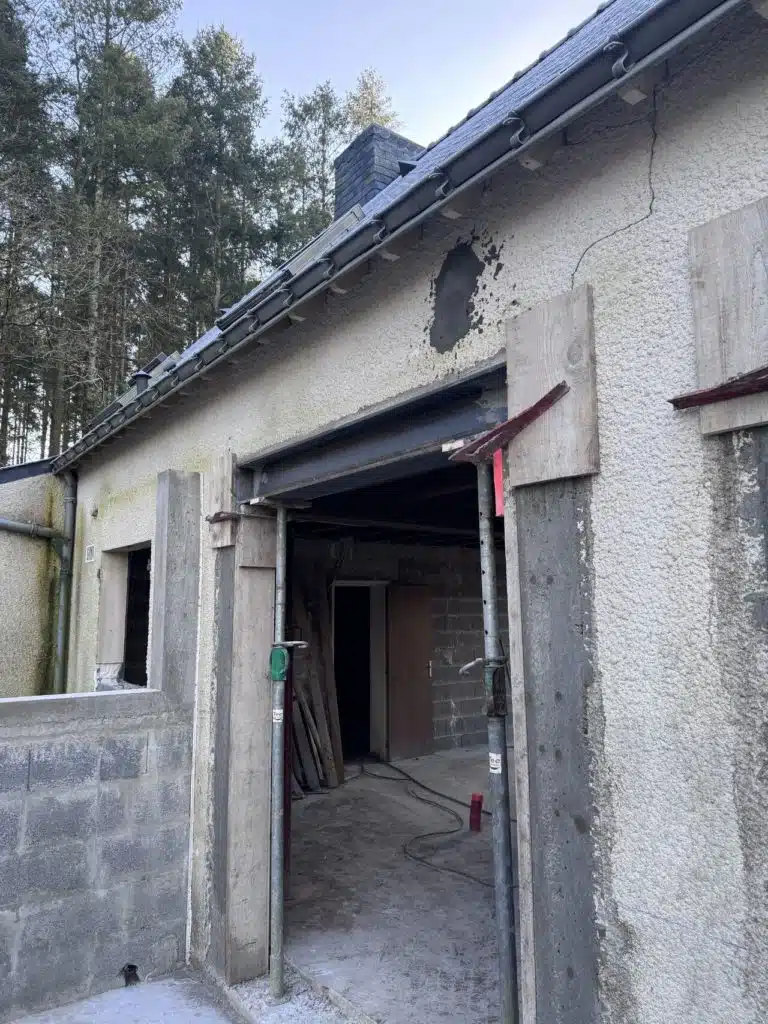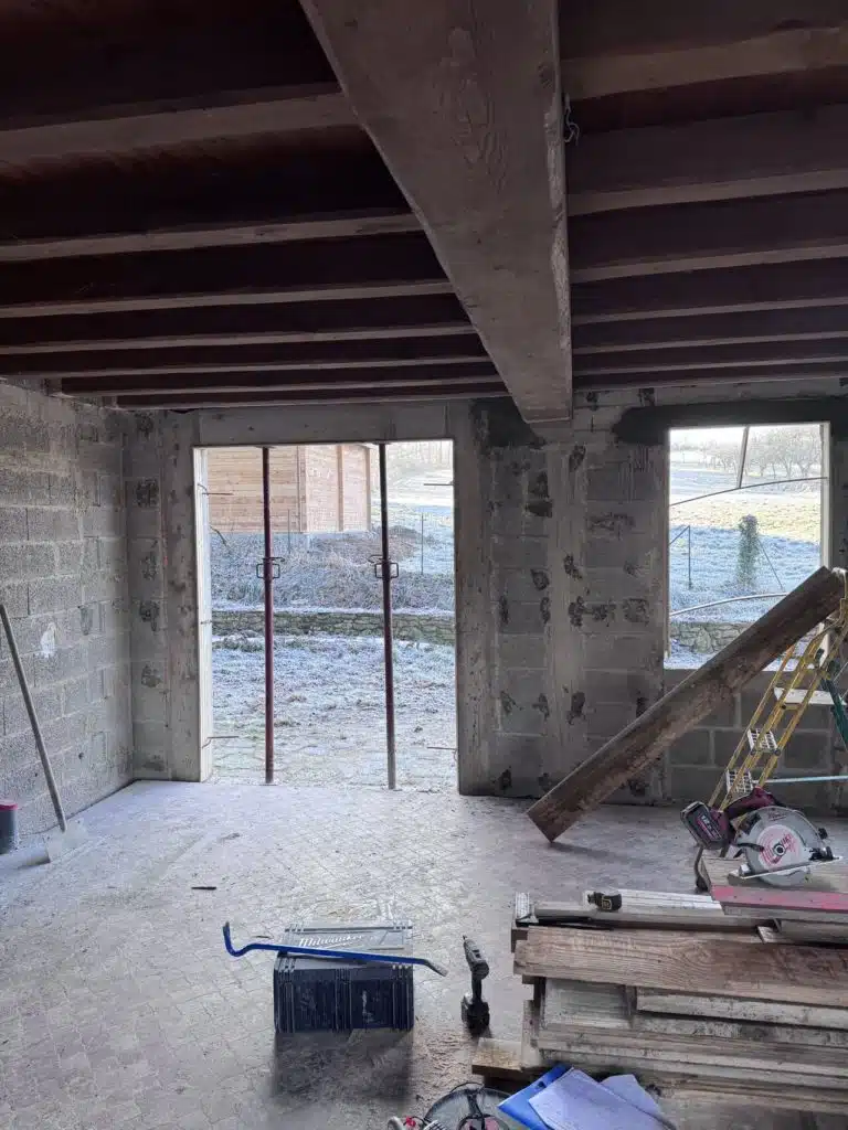 Les travaux avancent! Saignées pour les canalisations, percements, mise en place IPN, dépose de cloisons, dépose de la couverture, traitement de la charpente, nouvelles menuiseries, plâtre sec, enduit, chauffage, vmc, sol et chape.
